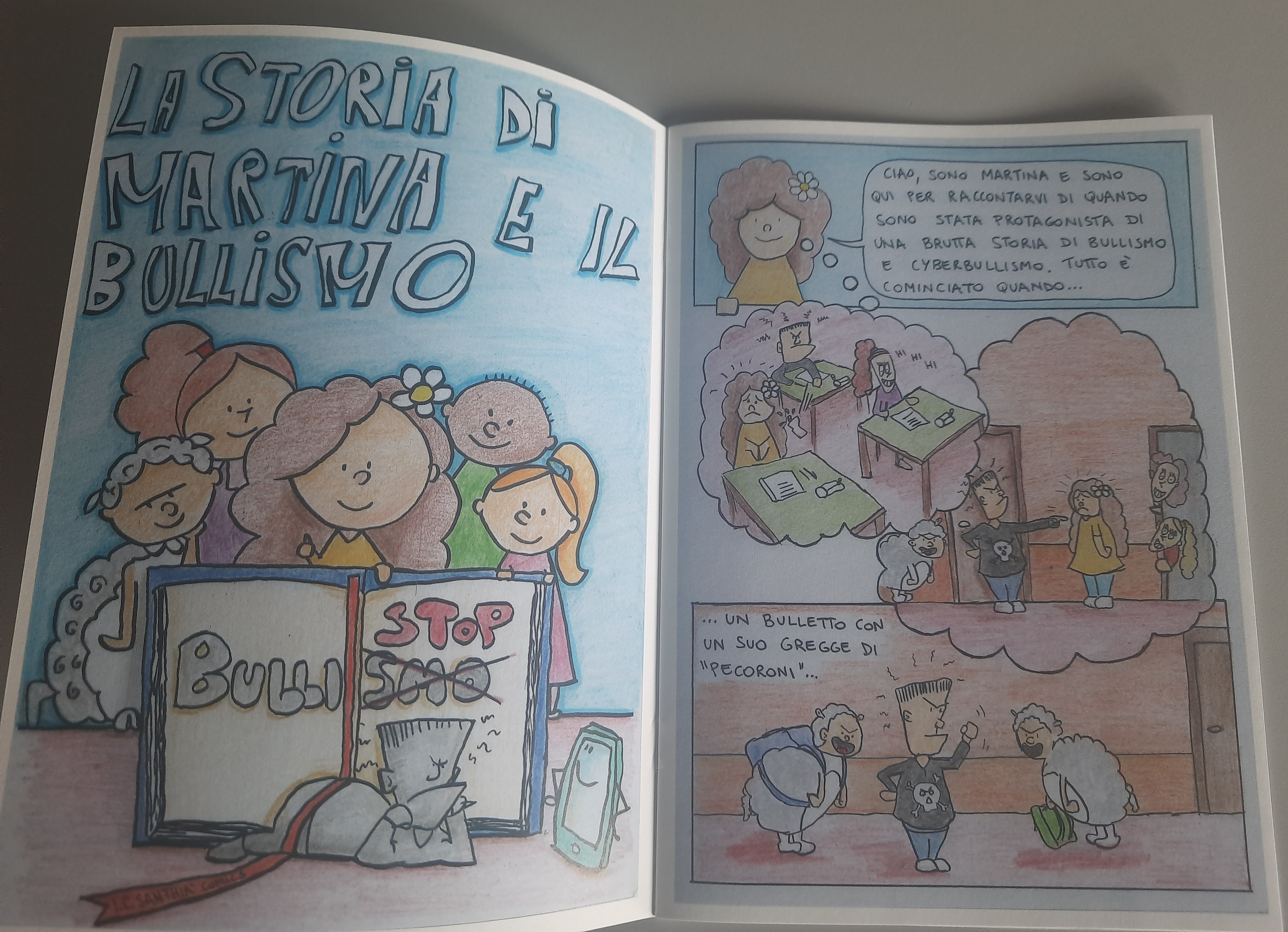 Nell'ambito del progetto "Abbasso il bullo: promozione del benessere a scuola" ha avuto un ruolo di primo piano il laboratorio di fumetto LA STORIA DI MARTINA E IL BULLISMO, finalizzato alla diffusione di azioni di sensibilizzazione sul tema del bullismo e del cyberbullismo e sull'uso corretto e responsabile di internet, dei social e del digitale. Gli studenti hanno assunto un ruolo attivo anche nell'organizzazione di vari momenti di riflessione e attività nelle quali sono state coinvolte anche le famiglie!